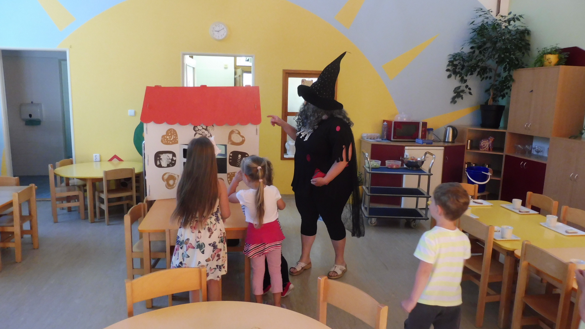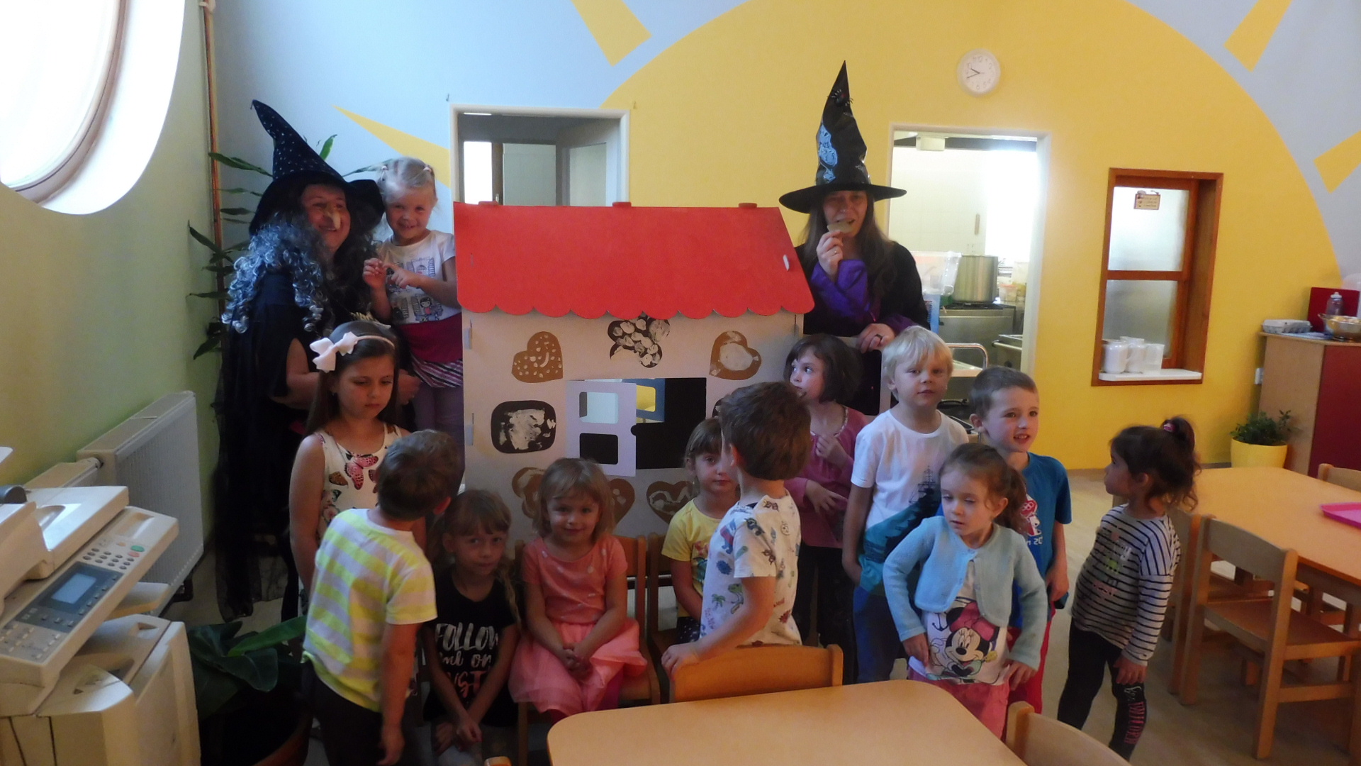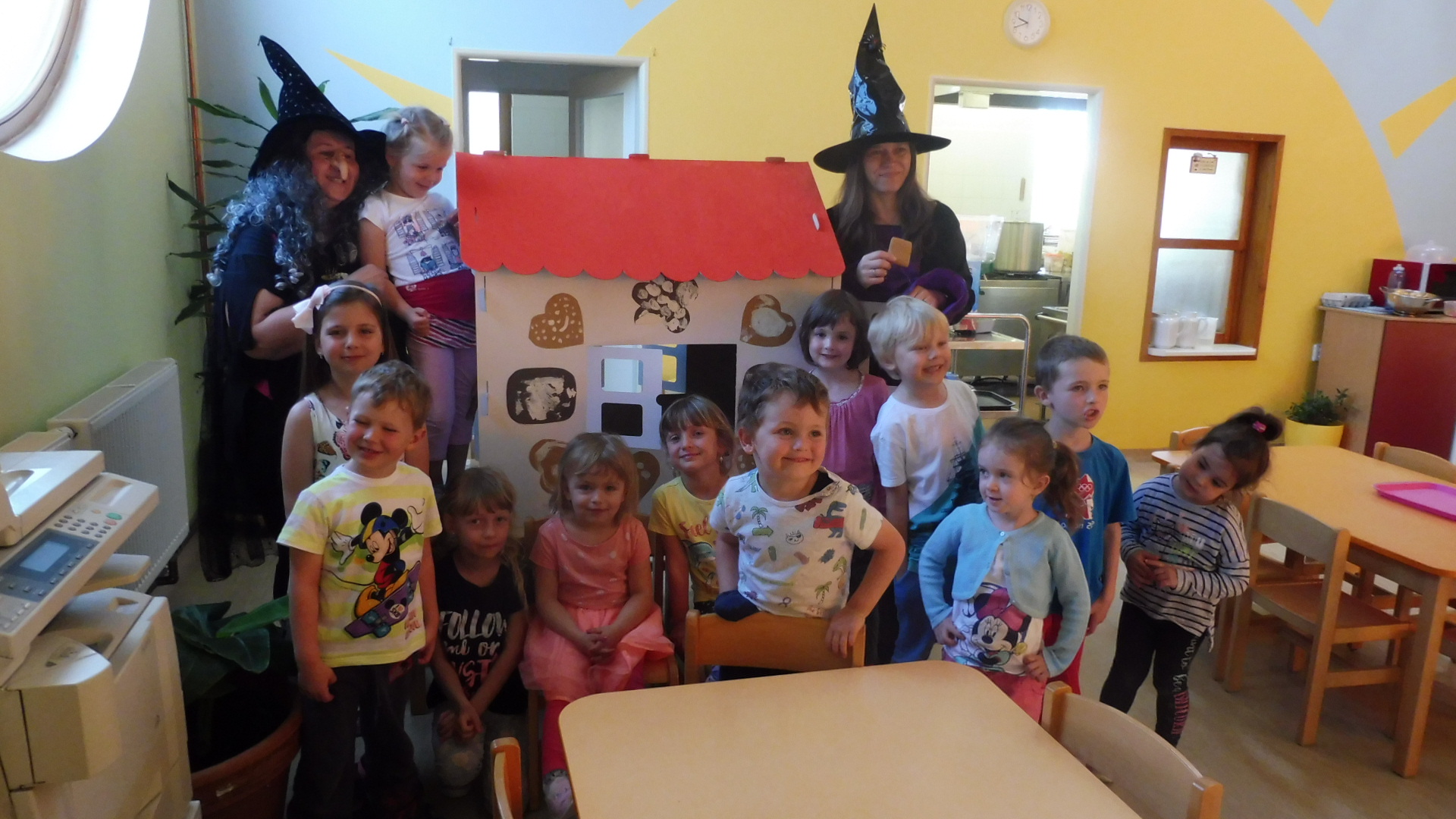 Tak i do naší školky dopoledne zalétly na koštěti dvě čarodejnice. Děti si s chaloupky mohly uloupnout a sníst ke svačince výtečný perníček.