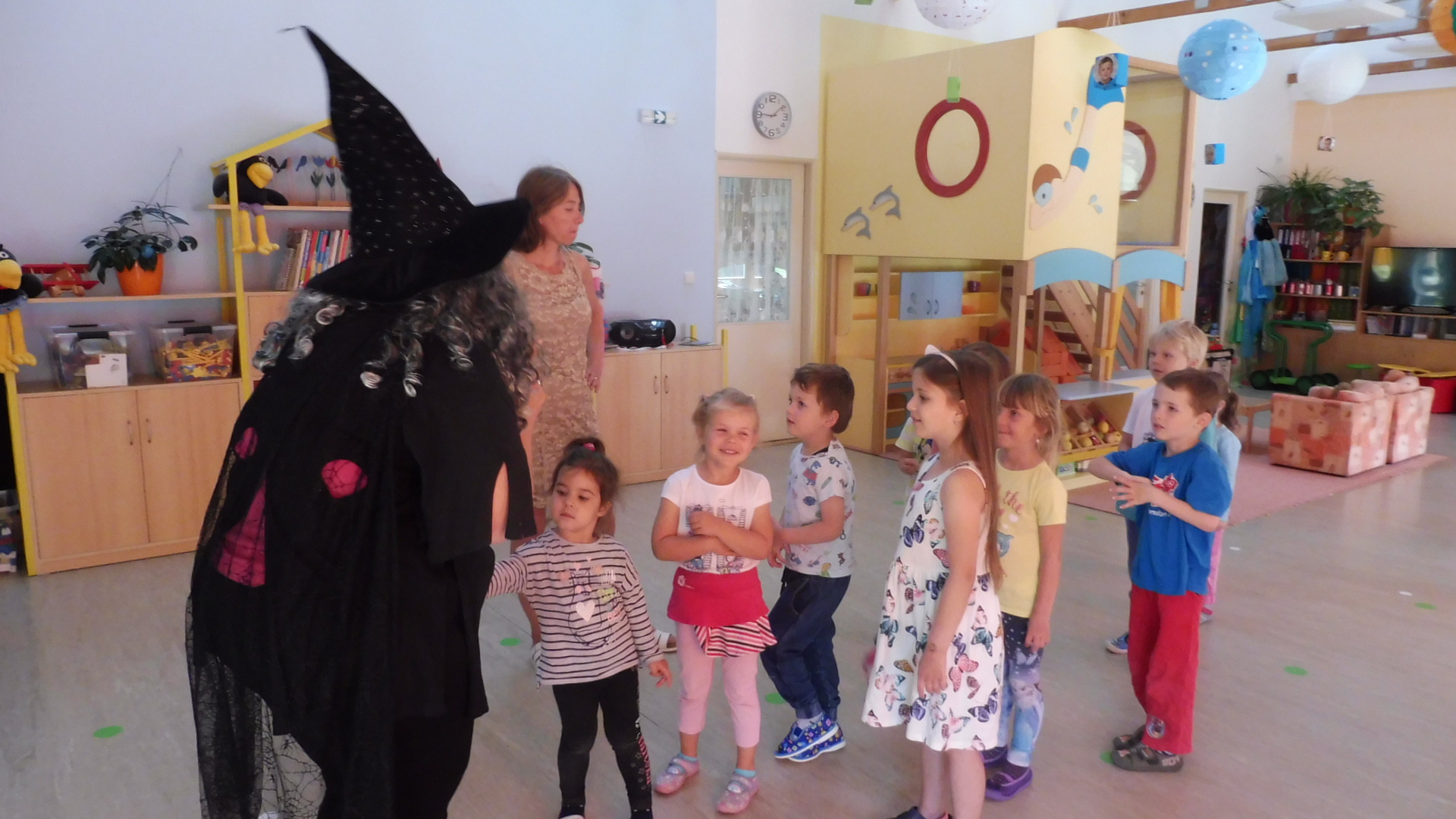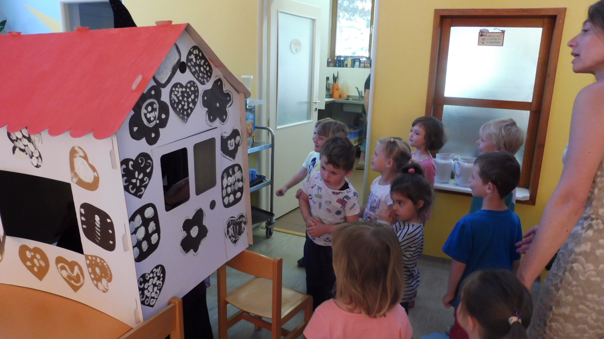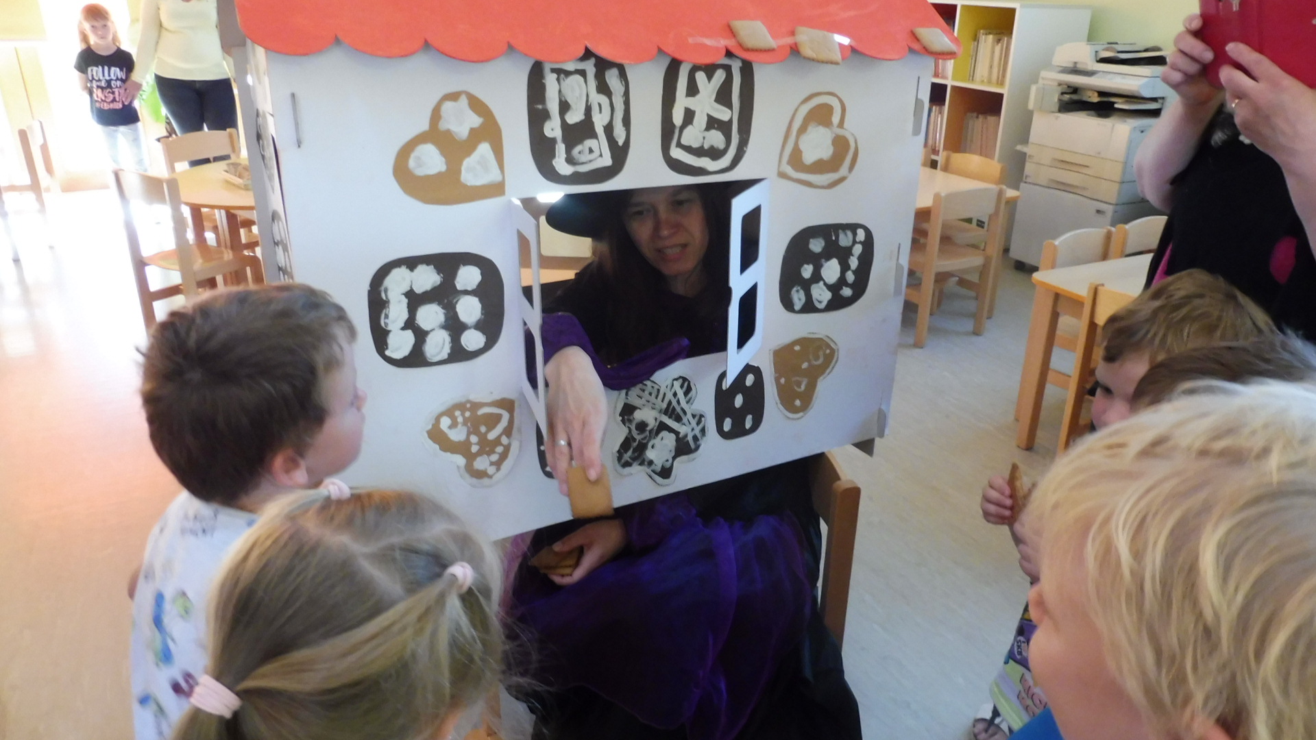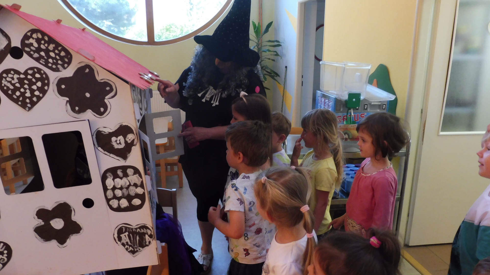 Tak i do naší školky dopoledne zalétly na koštěti dvě čarodejnice. Děti si s chaloupky mohly uloupnout a sníst ke svačince výtečný perníček.