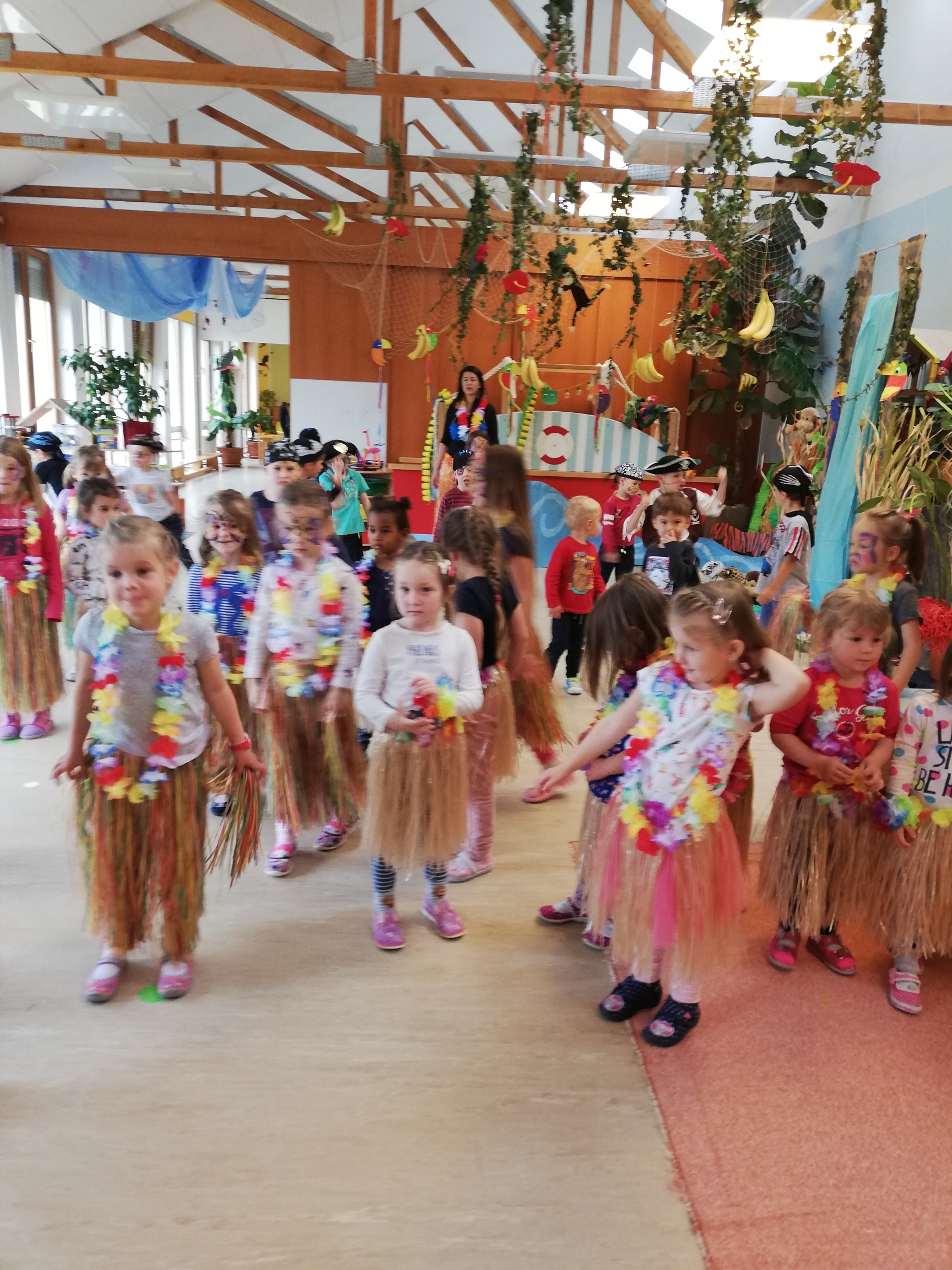 V rámci dnešního nocování si holčičky oblékly havajské sukýnky a květinové věnečky, chlapci si nasadili pirátské šátky. Kdo chtěl, nechal si namalovat od paní učitelek na obličej – motýlka, hada či piráta. A všichni jsme se společně oddali tanečním aktivitám v rytmu havajské melodie . Aloha
